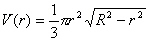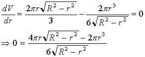 Before we proceed we should specify the domain of V. What values is r allowed to have. The smallest r can be is zero but how big can it be? Well, the only other variable which can be zero is h and i h=0 then r=R. So we have the domain of V(r) is [0,R]. Notice also that V(0)=0 and V(R)=0, so these will not give us a maximum (I hope) and the other possibility should come from Calculus methods. So, we now try to find critical points. We now take the derivative of V with respect to R and set it equal to zero.
