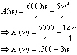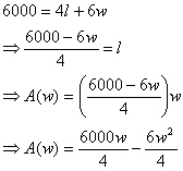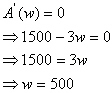 Now that we have a function of one variable we may employ techniques from Calculus to find critical points. Remember also that we need to establish boundary conditions on w. This can be achieved by looking at the cost function. First notice that the smallest l or w can be is zero. So, if l is zero how big is w? Manipulating the cost equation tells us that if l is zero then w=1000. So the domain for w is exactly [0,1000]. Notice that although you should always check the boundary points to find a global min or max these boundary conditions will yield a zero area. Not too practical. With this taken in to account it seems fair to reason that the critical point achieved from manipulating the first derivative will give us the desired solution.